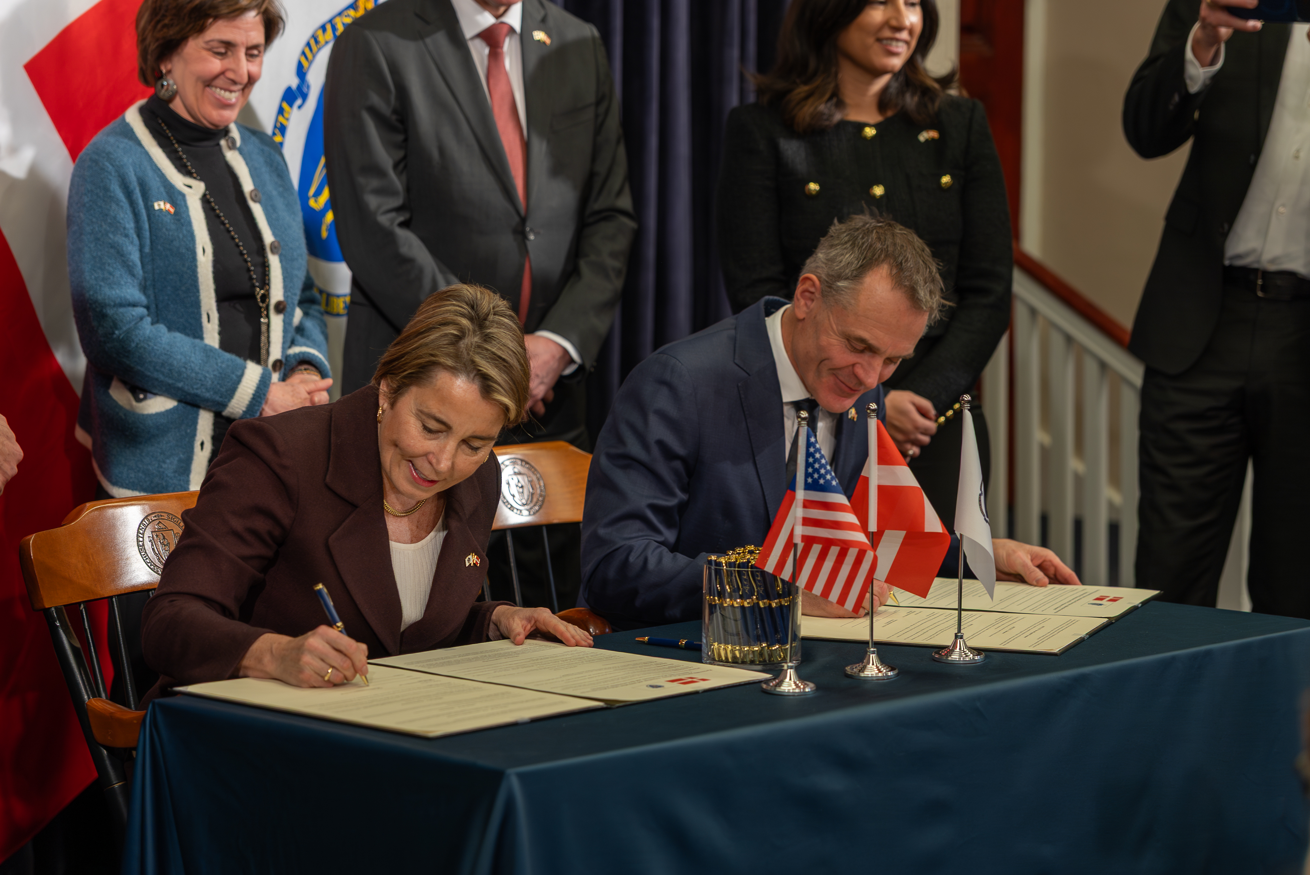 Samarbejdsaftalen blev underskrevet af guvernør for Massachusetts Maura Healey og Danmarks ambassadør i USA Jesper Møller Sørensen på vegne af uddannelses- og forskningsminister Christina Egelund.